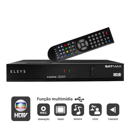 O Elsys Satmax é um aparelho completo. Este modelo proporciona grande quantidade de canais abertos com qualidade HD em qualquer lugar do Brasil. O SATMAX sintoniza canais digitais SD, HD e 3D. É o único a receber o sinal da GLOBO HD, regional* ou nacional. Além disso dispõe dos fantásticos recursos Multimídia como gravação, reprodução e Pause & Play na entrada USB, para você não perder nenhum detalhe da programação.